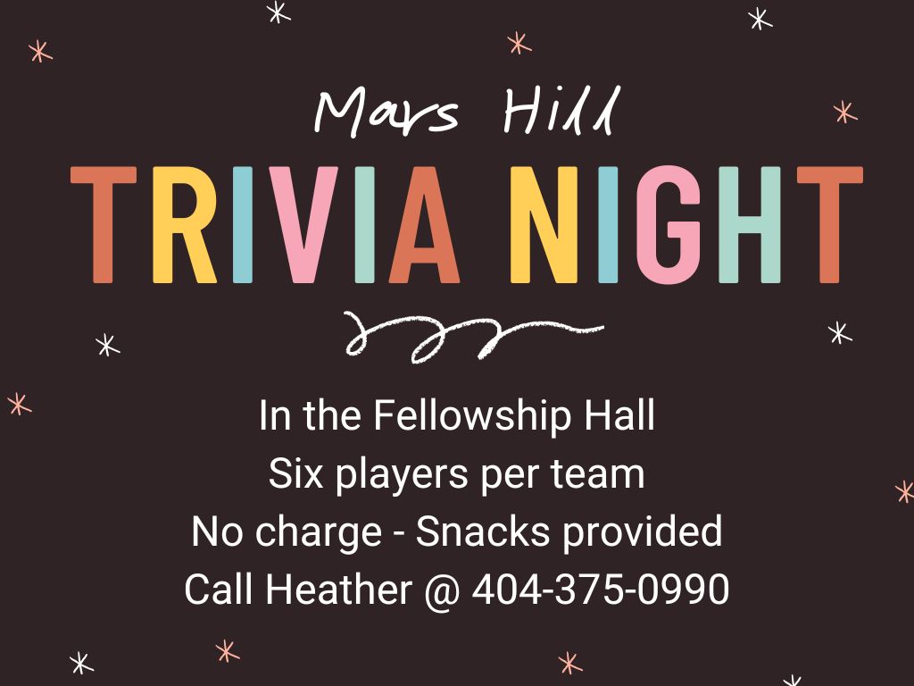 Trivia Night will be so much fun! If you want to register as a team of six contestants, please do so here. If you want to come solo, Heather will be happy to get you onto a team. Our Driving Miss Daisy ministry will be available to pick up those who want to attend, but are not driving. Children’s Club will also be available for parents who want to attend Trivia Night. Light snacks will be available.