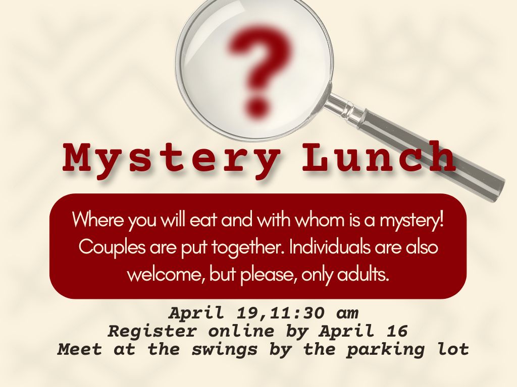 Join us for a mystery! Meet new people and reconnect with old friends. Please register by April 16 so we can make reservations.