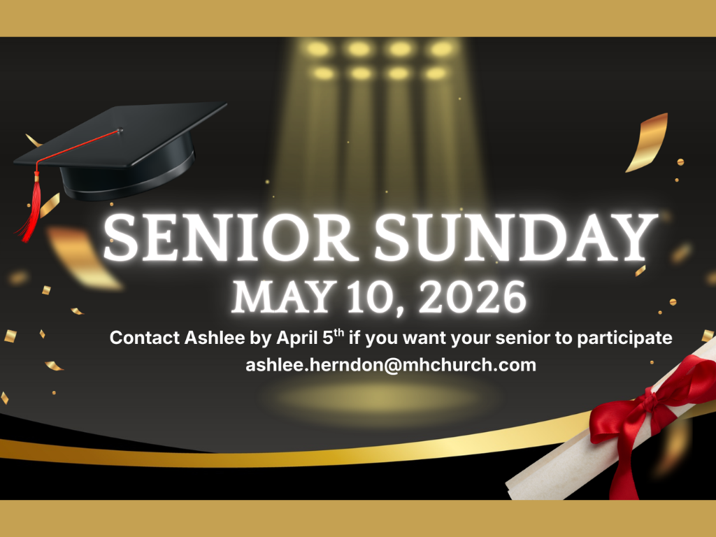 We will celebrate our graduating seniors on May 10th! Please let Ashlee Herndon know by April 5th if your senior wants to participate. Contact Ashlee at Ashlee.Herndon@MHChurch.com or text her at 336-392-0355. Please register by April 5th.
